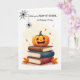 Abróchese la Halloween de un estudiante con este diseño lúdico que incluye una calabaza alegre encaramada en libros mientras una araña cae de su web. Perfecto para hijos, hijas, nietos o amigos lejos de la universidad o del internado, esta tarjeta festiva ofrece un mensaje reflexivo de alegría en el hogar y las vacaciones. Con sus desenfadadas imágenes de Halloween y su cálido sentimiento, es una manera divertida de recordarles que son amados y extrañados mientras están lejos del colegio.