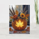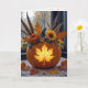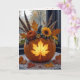 Diseño de hojas de arce brillando en una calabaza otoñal con plumas de faisán y flores caídas. Se puede cambiar el texto interno.