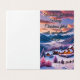 La tarjeta presenta el paisaje escénico de la imagen, transformada en un paraíso de nieve. Las montañas están empolvadas de nieve blanca, y las nubes dramáticas en el cielo han tomado tonos suaves de rosa y lavanda, que recuerdan a una puesta de sol mágica en invierno.