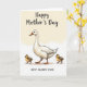 Esta tarjeta muestra un ave acuática alta y blanca que se mantiene orgullosamente en el centro, con una suave inclinación de cabeza que sugiere una vigilancia cariñosa ❤️. Su pico naranja y sus patas palmeadas a juego añaden un cálido toque de color contra las suaves plumas cremosas. Dos pequeños polluelos esponjosos se mantienen cerca a ambos lados, coloreados en amarillo dorado con motas de marrón claro, inclinándose como si se sintieran más seguros cerca de su guardián. Sus ojos mirando hacia adelante y su postura ligeramente recogida crean una escena tierna y centrada en la unión que se lee como una amistad tranquila y una cercanía familiar. El fondo es un lavado de crema cálida, como la luz de la mañana tardía, que mantiene el entorno simple y tranquilo 🌼. Un breve saludo se encuentra cerca de la parte superior en un tono naranja suave, con una línea de texto más pequeña colocada debajo en un marrón apagado. La fina sombreado a lo largo de las alas y el cuello del ave adulta da profundidad a la ilustración, mientras que el plumón de los poll