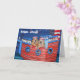 Esta tarjeta del 4 de julio cuenta con recuperadores de oro vestidos con atuendos patrióticos y gorras marineros en un barco rojo, blanco y azul. El texto dice "¡Ships Ahoy!" y "¡Es el 4 de julio, entonces SEAS el día!".