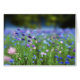Campo de flores de maíz en tonos azules, púrpura, lavanda y rosa, con hojas verdes pálidas.