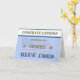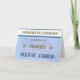 Ofrece un fondo azul claro, estrellas del oro y una bandera americana. Texto en oro con el "cordón azul" en azul.