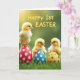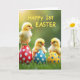 This card shows three fluffy golden-yellow baby birds gathered close like old friends, their bright eyes and tiny orange beaks turned toward one another in a gentle, affectionate cluster. One chick stands atop a red egg with white dots, balancing carefully as if showing off for the others. To the right, a second chick leans against a blue egg with white dots, its posture suggesting a quiet, companionable nuzzle. Nearby, a third chick rests beside a yellow egg sprinkled with blue spots, completing the cozy little group 🌷. Soft light streams in from the upper left, warming their downy feathers and casting small shadows that add depth without harsh edges. The background fades into a blurred green setting, like fresh spring leaves, keeping the focus on their closeness. Across the upper area, the words “HAPPY 1st EASTER” appear in bright yellow lettering, standing out clearly above the birds and eggs 🐇. The red, blue, and yellow eggs sit near the bottom foreground with crisp dotted patterns against the soft green backdrop.