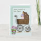 Niña bonito con un gran arco verde en la cabeza, sentada en un cochecito vintage con una olla de tulipanes de lavanda en la parte inferior izquierda del diseño. Fantástica tarjeta para mandar a alguien a invitarlos a una ducha de bebé. Gracias a KazKraft, diseños de Elena y Hungryjpeg por algunos de los elementos del diseño