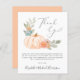 Una tarjeta de agradecimiento económica para tu fiesta de ducha de bebé que incluye "Gracias" en un elegante guión gris con un toque de corazón, y un ramo de acuarela de calabaza naranja pastel, flores y vegetación. Personaliza tu mensaje de agradecimiento en una simple tipografía gris claro y moderna y agrega tus nombres en un guión gris característico.
