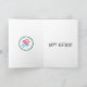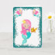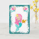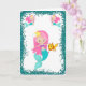 Una tarjeta de cumpleaños muy dulce de sirena con una sirena adorable con el pelo rosado repitiendo su mascota de pez dorado, rodeada por un marco de purpurina verde azulado (para emular la arena). El interior contiene otra imagen de sirena, y el tradicional saludo de cumpleaños (Feliz Cumpleaños) que se puede personalizar a la medida.