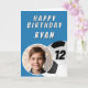 Tarjeta de cumpleaños de la foto de la pelota de fútbol azul. Este diseño presenta gráficos clásicos de fútbol, tipografía audaz y espacio para una foto personalizada del niño de cumpleaños.