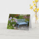 Banco de madera azul en tarjeta de saludo del jardín de primavera