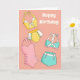 Esta tarjeta dice "Feliz Cumpleaños" en la parte delantera y "Otro año te queda bien" en el interior, pero puedes personalizar tanto el texto frontal como el interno con tu propio mensaje si lo prefieres. Esta tarjeta presenta bonitos ilustraciones de trajes de baño vintage en colores pastel bonito.