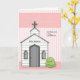 Nombre personalizado de la niña para bautismo Felicitaciones en tonos dulces rosados con rayas verticales y un dulce ilustracion de una iglesia o capilla.