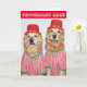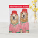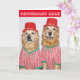 Esta tarjeta de vacaciones incluye a los recuperadores de oro usando ropa de rayas de caña de caramelo y sombreros de top rojos. El texto dice: "Barca de menta" y "¡Te deseo una temporada dulce!". Esta tarjeta es perfecta para enviar Navidades o durante las vacaciones de invierno.