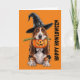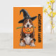 Tarjeta Basset hound con sombrero de bruja y calabaza