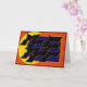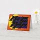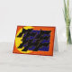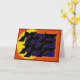 Una tarjeta de saludo de Halloween. Los murciélagos que sobrevuelan la luna son un regalo, mientras desfilan a través de un cielo con motivos. Esta tarjeta tiene bordes coloreados tipo edredón.