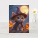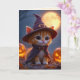Un lindo gatito con un traje de bruja para Halloween. Las calabazas varían en tamaño y brillan con una suave luz naranja. El ambiente es acogedor y nocturno. ¡bonito, tarjeta personalizado de Halloween para todos!