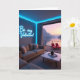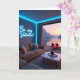 This design shows a modern living room opening to a wide lake-and-mountain view through tall glass doors, where the calm scenery feels like it’s sharing a quiet moment with the cozy interior. A plush sofa in soft neutral tones faces a low, streamlined coffee table, setting a relaxed spot that suggests two people could easily lean in close and talk for hours 🥰. On the main wall, a glowing sign reads “Be my Valentine!” in luminous blue, with the words centered and bright against the darker wall surface. The cool blue light from the sign and subtle ceiling lighting washes the room gently, while outside the sky shifts through lavender, rosy pink, and warm gold near the horizon ❤️. On the deck, two deep red lounge chairs sit angled toward the water, like a pair waiting side by side for someone to settle in. The lake mirrors the soft colors of the sunrise or sunset, and the mountain silhouettes frame the distance with a quiet, cinematic stillness. The blue lettering stands out sharply indoors as the red chairs punctuate the deck, and the glass doors reflect faint hints of the neon glow.