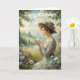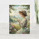 Una dama disfruta de una taza de té en el jardín de flores. Adecuado para una tarjeta de cumpleaños para cualquiera. Siéntase libre de cambiar el texto