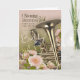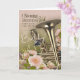 A warm and elegant BELATED birthday card showcasing a polished brass horn surrounded by delicate pink flowers and fresh greenery. The soft pastel backdrop blends beautifully into the floral base, making this the perfect late birthday greeting for someone who loves music, instruments, and gentle artistic visuals.