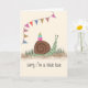 This is a cute belated birthday card showing a snail crawling along the ground with two presents and cupcake with a candle on its body. There is a colorful flag banner with the text ‘sorry I’m a little late.’