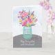 Desea bendiciones a tu hijastra y su esposo en su aniversario. Este bonito florero de masonita contiene un ramo mixto de flores con aspecto de acuarela en una mesa a rayas. Tarjeta religiosa bonita para decir feliz aniversario.