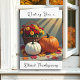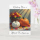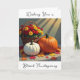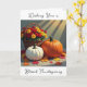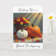 Una tarjeta de bonito con bendiciones de Acción de Gracias dentro que se puede personalizar. La cubierta tiene un ilustracion de calabaza blanca y naranja, Mamáes coloridas y hojas de otoño.