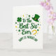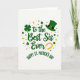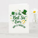 This card features a white background filled with green and gold St. Patrick’s Day details that feel like a sweet nod from one sister to another 💚. Centered on the front, the large message “to the Best Sis Ever” appears in emerald green, with smooth, flowing letters that draw the eye right away. Just beneath it, “HAPPY ST. PATRICK’S DAY” curves in a sturdier green type, forming a gentle arc that frames the main line. Around the words, small four-leaf clovers, gold stars, and scattered dots float like confetti, giving the layout a lively, affectionate energy ☘️. The greens range from deep forest to bright emerald, while the gold accents add little flashes of shine without crowding the page. In the upper right corner, a tilted deep green leprechaun hat with a gold buckle adds a cheeky, friendly touch, as if it’s tipping hello. Near the bottom, a golden horseshoe sits in a graceful curve, nestled among clovers and tiny starbursts.