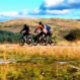 Una acuarela de tres hombres en bicicleta de montaña en las colinas galesas.