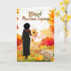 Hermosa escena de árboles de otoño, hojas y calabazas para el equinoccio de otoño con una encantadora mujer afroamericana vestida de negro con hojas y un girasol. Solicite este diseño con otros tonos de piel y estilos de cabello enviándome un mensaje aquí en Zazzle. ¡Ten un Mabon bendito y Magickal!
