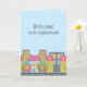 "¡Bienvenidos al barrio!". El diseño se caracteriza por un bonito barrio urbano con un fondo azul claro. Perfecto para condominios y apartamentos.
