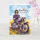 Para la mamá ciclista que está teniendo un cumpleaños, este es un divertido saludo con tema de moto con un campo de flores silvestres y una mujer de mediana edad.