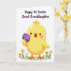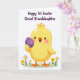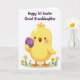 This design shows a sunny yellow baby bird with a round body and a wide, open-mouthed smile, holding a deep purple Easter egg close as if presenting it to someone special 🐣🌷. Soft blush-pink cheeks and tiny highlights on its feathers add a tender, friendly look, like it’s sharing a sweet moment with a loved one. The background stays bright white, keeping the focus on the bird and its gift-like egg. Under its feet is a small patch of green grass sprinkled with simple little flowers in white and yellow. The purple egg is decorated with curly, repeating shapes and dots that give it extra detail without crowding the scene. Across the top, the message “Happy 1st Easter Great Granddaughter” appears in bold purple text, centered and easy to read. The shapes are smooth and the colors are flat and bright, giving the illustration a modern, cheerful finish 🐰. A few small blossoms sit near the grass line, with the bird positioned slightly below the centered purple greeting.