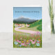This birthday card depicts a picturesque mountainous landscape with a charming country town nestled in the background. A woman is seen strolling a dog through a field of vibrant wildflowers. The card’s message is a heartfelt wish for a relaxing birthday.