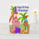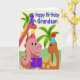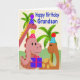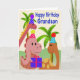 This is a cute birthday card for your grandson. It has three adorable dinosaurs wearing party hats holding a present and standing in front of a couple of palm trees.