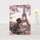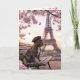 A French bulldog in a beret sits on a bench amidst cherry blossoms, with the Eiffel Tower creating a charming backdrop for a perfect Parisian springtime scene