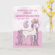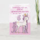 Un lindo poni rosa como tu bisnieta está brincando con el número seis. Detalles con apariencia dorada están entretejidos en su crin y cola. ¡Tarjeta perfecta para desearle un feliz cumpleaños número seis a tu bisnieta!