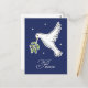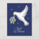 Postal de vacaciones con un ilustracion de una hermosa paloma blanca con una rama de olivo. Fondo azul oscuro con estrellas blancas y el texto "Paz" debajo de la paloma.