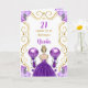 Esta invitación a la tarjeta de cumpleaños tiene un marco dorado elegante, una bella princesa con el pelo rubio y un vestido morado, flores y un globo.