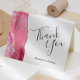 Esta elegante y moderna tarjeta de agradecimiento boda cuenta con una barra acuática rosa bordeada por un falso purpurina de oro. El texto del personalizable combina las palabras "Gracias" en el guión de escritura a mano gris carbón y los nombres de la novia y el novio en letra cursiva en un fondo blanco.