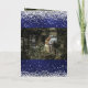 Un fondo azul marino de colores desiguales, decorado con un falso confeti plateado. Interior: 1ª de sus fotos, tamaño vertical. Su nota de agradecimiento. Parte posterior: 2 de sus fotos, tamaño del paisaje.