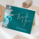 El borde izquierdo de esta romántica carta de agradecimiento boda incluye un ramo de flores turquesas acuarelas floridas adornado con un purpurina de imitación plateada. Las palabras "Gracias" aparecen en el guión de escritura a mano gris plateado, con los nombres y la fecha de boda debajo en letra de copperplate, en un fondo turquesa.