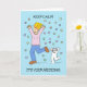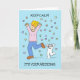Un simple ilustracion de una mujer rubia de cabello y un gato blanco corriendo por el confetti en pánico. La imagen se coloca sobre un fondo de color azul pálido. ¡Una tarjeta de diversión para mandar a cualquier novia que esté empezando a entrar en pánico por sus arreglos bodas!