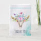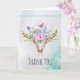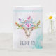 Tarjeta de agradecimiento con un fondo de acuarela turquesa y pastel. Un cráneo de animal boho chic con un ramo floral sobre su cabeza y pequeñas mariposas revoloteando. Un borde decorativo lindo con pequeñas formas de lágrima en azul claro. Mensaje personalizado dentro.