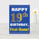 This simple birthday-themed greeting card design features a warm birthday wish like "HAPPY 19th BIRTHDAY, First-Name!" on the front, in bold text on a blue colored background. The birthday number has a faux/imitation gold-like coloring look. The name on the front can be customized. The inside features a customizable birthday message. A greeting card like this could be a fun way to deliver birthday wishes to somebody who is celebrating their nineteenth birthday. [~Z0000278]