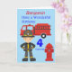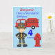 Diseño divertido de un bombero con el camión de bomberos y la boca de incendio. Esta tarjeta sería una tarjeta divertida para enviar a cualquier niño que esté cumpliendo años y le guste jugar con camiones y figuras. La edad en la parte frontal y la edad en el casco se pueden modificar a una edad diferente, el nombre en la parte superior de la tarjeta y el mensaje en el interior, que dice "Feliz cumpleaños ..... que tengas un tiempo Fantástico.... con amor de ...." se pueden modificar para personalizar la tarjeta.