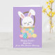 Personalizar esta linda tarjeta de conejito Feliz Pascua con tu propio texto personalizado con el nombre de tus hijos en escritura blanca. Este adorable conejo de conejo se sienta en una cesta de Pascua de bonito con una hermosa tarjeta morada.