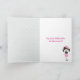Esta tarjeta de moda presenta un fondo cardíaco gris y rosa con la Torre Eiffel, un dulce caniche y el chica más amable con el saludo francés "Bonjour!".