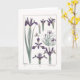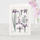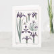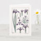 Tarjeta de saludo en blanco con un ilustracion botánico de flores de iris en morado, del artista francés Maurice Pillard Verneuil. Una litografía con el método pochoir de colorear los dibujos a mano, que se ha mejorado y alterado digitalmente.