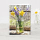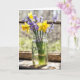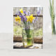 Dafpies amarillos y flores moradas en un frasco de albañil por una rústica ventana de una casa de campo. Se puede cambiar el texto.