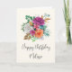 Tarjeta de cumpleaños con un arreglo floral que contiene rosas rosa bonito, naranja y blanco rodeadas de hojas verdes.