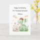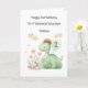 This birthday card is suitable for a grandson or son's first, 2nd or 3rd birthday. The design includes the number 2 (which can be changed or removed), birthday stars, watercolour grass, flowers and rocks, and a green and orange dinosaur with balloon.